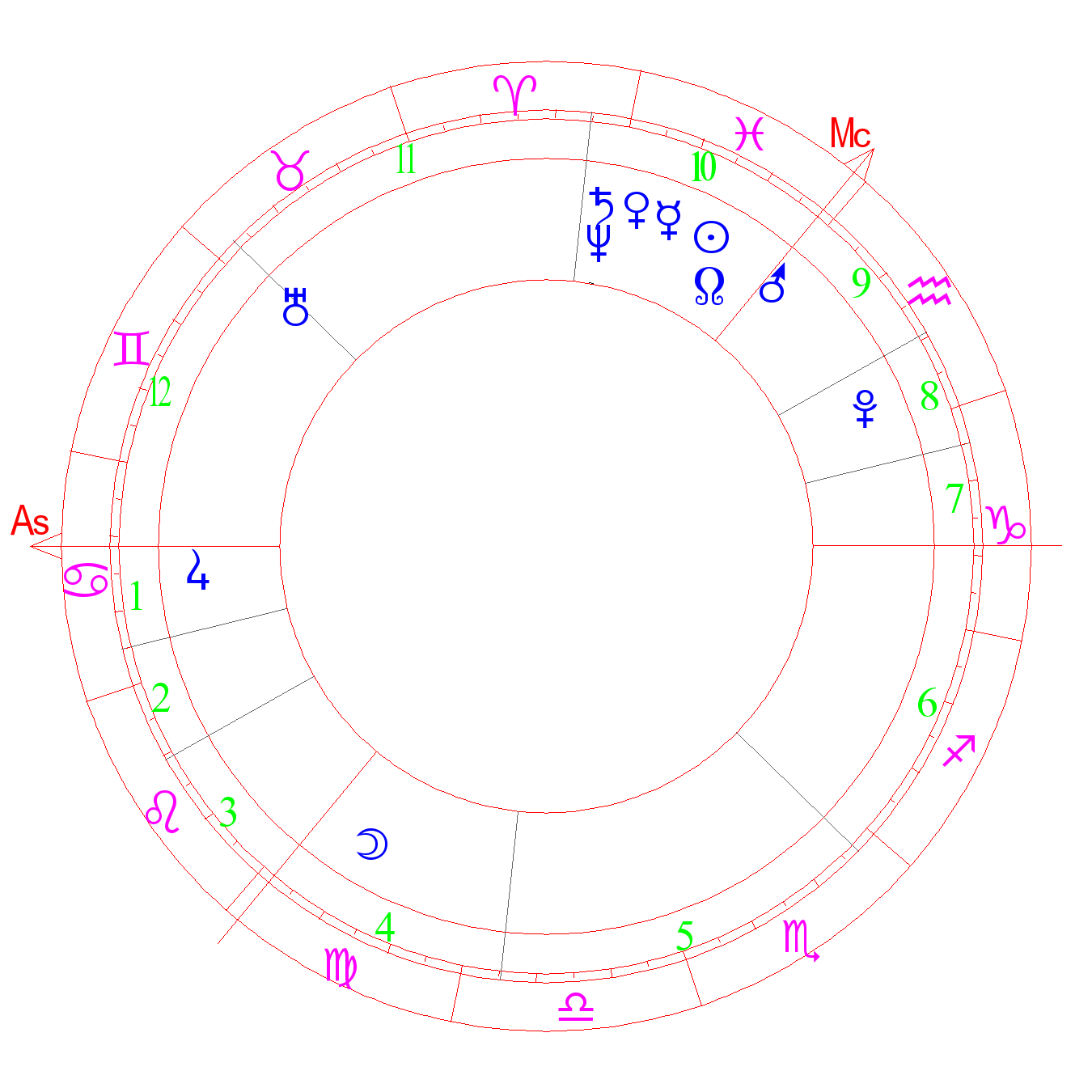 The degree of astrologists. A kind, loving nature. A happy family life. [-] loneliness, superstition, inner emptiness. Too strong secret enemies, madness (ASA). Great love and great passion, a good actor, excessive changes of feelings. The degree of the Moon (Kefer)