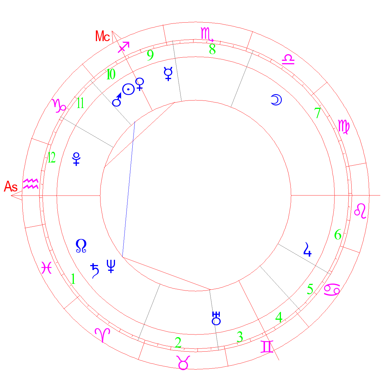 A difficult struggle during the life, a spirit of contradiction. Agression. Danger of wounds from firearms or cold weapons. A military career. Sometimes results in inclination to perversion, murder (ASA). Fighting, aggressiveness, fiery temper, danger of injury, mathematical abilities, caecitis when damaged, confused insanity. The degree of Jupiter (Kefer). Faith. Growth (deVore)